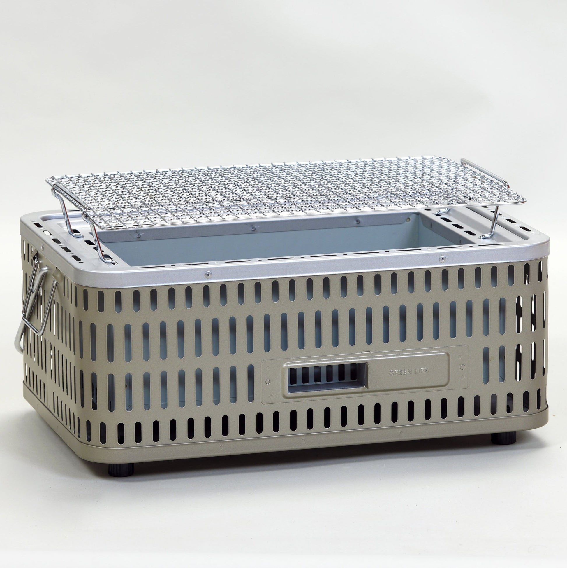 Burns charcoal or briquettes, safe to put on tables, 2 height setting, portable, lightweight, carry handles.