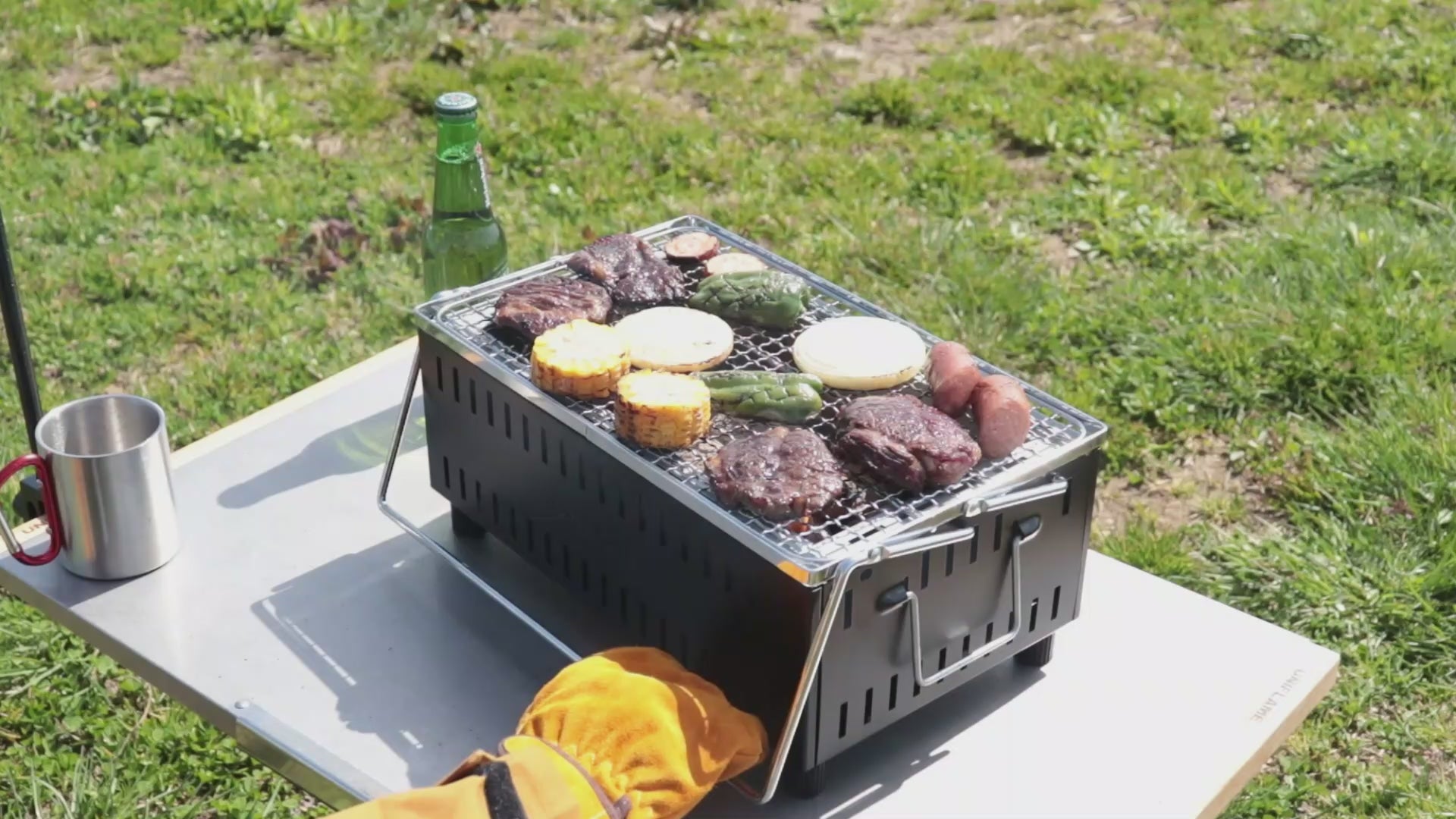 Burns charcoal or briquettes, safe to put on tables, portable lightweight, carry handles.